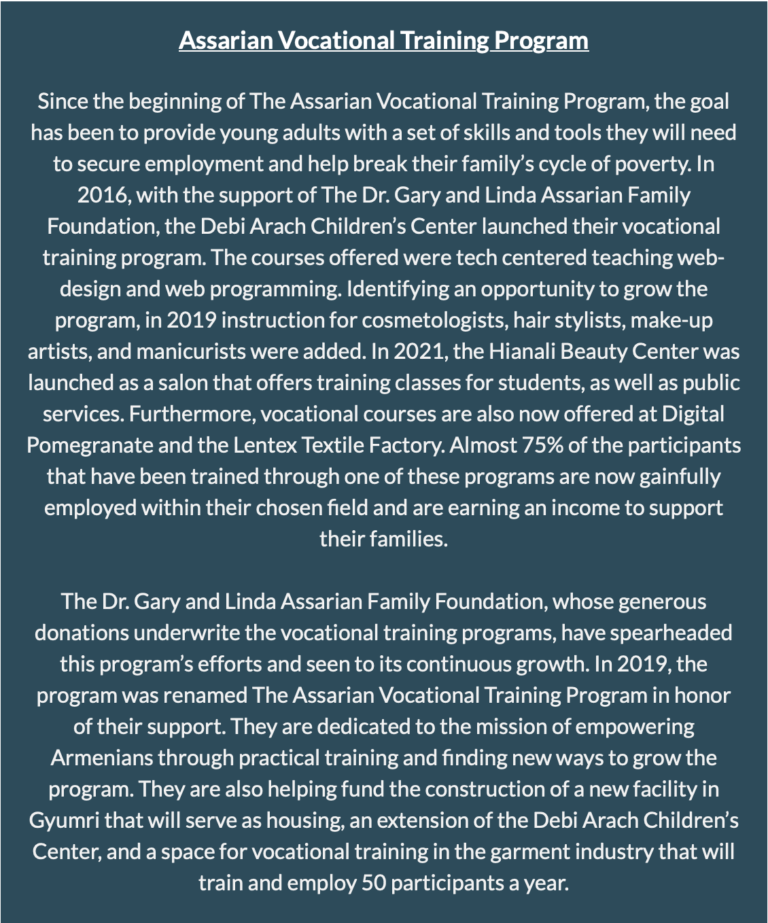 “We are committed to creating a diverse number of opportunities for people. So far, it is uncanny how successful program participants have been. Through vocational training, people are able to have employment opportunities because they now have a marketable trade. The vocational training covers a vast span of local industries giving people an opportunity to live free and prosper where they currently reside. Part of our mission is to instill opportunities for local Armenians to be able to earn a living