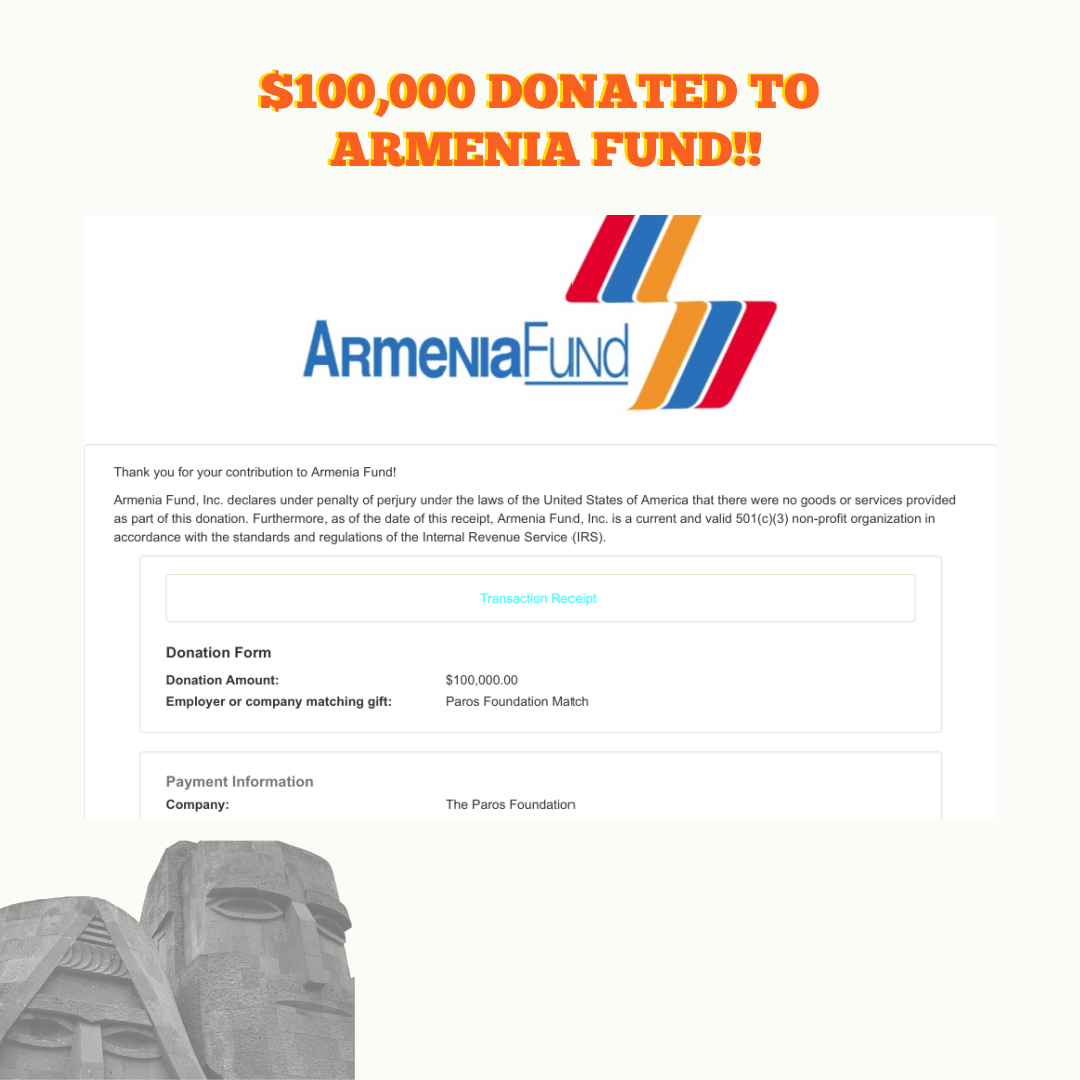 Funds from this challenge grant will be donated to support Armenia Fund in their entirety. For more information about this effort, please contact (310) 400-9061 or email: info@parosfoundation.org.