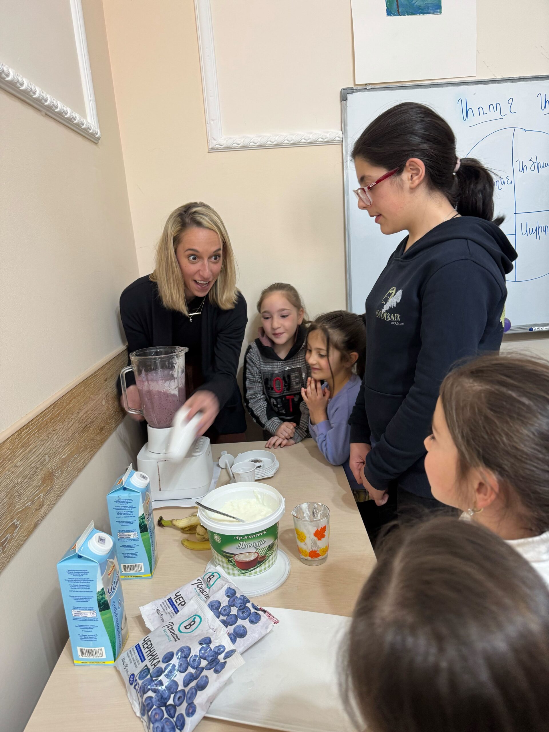 Nutritionist, Stephanie Sudjian, who is spearheaded the Nourishing Armenia! project spent the day at Debi Arach teaching the children how to make nutritious smoothies. She was also able to check in on the progress of the Nourishing Armenia Gyumri Greenhouse. The greenhouse will serve as a sustainable food option to promote healthy eating, which aims to create a lasting impact on the health & well-being of children and families in Armenia.Â