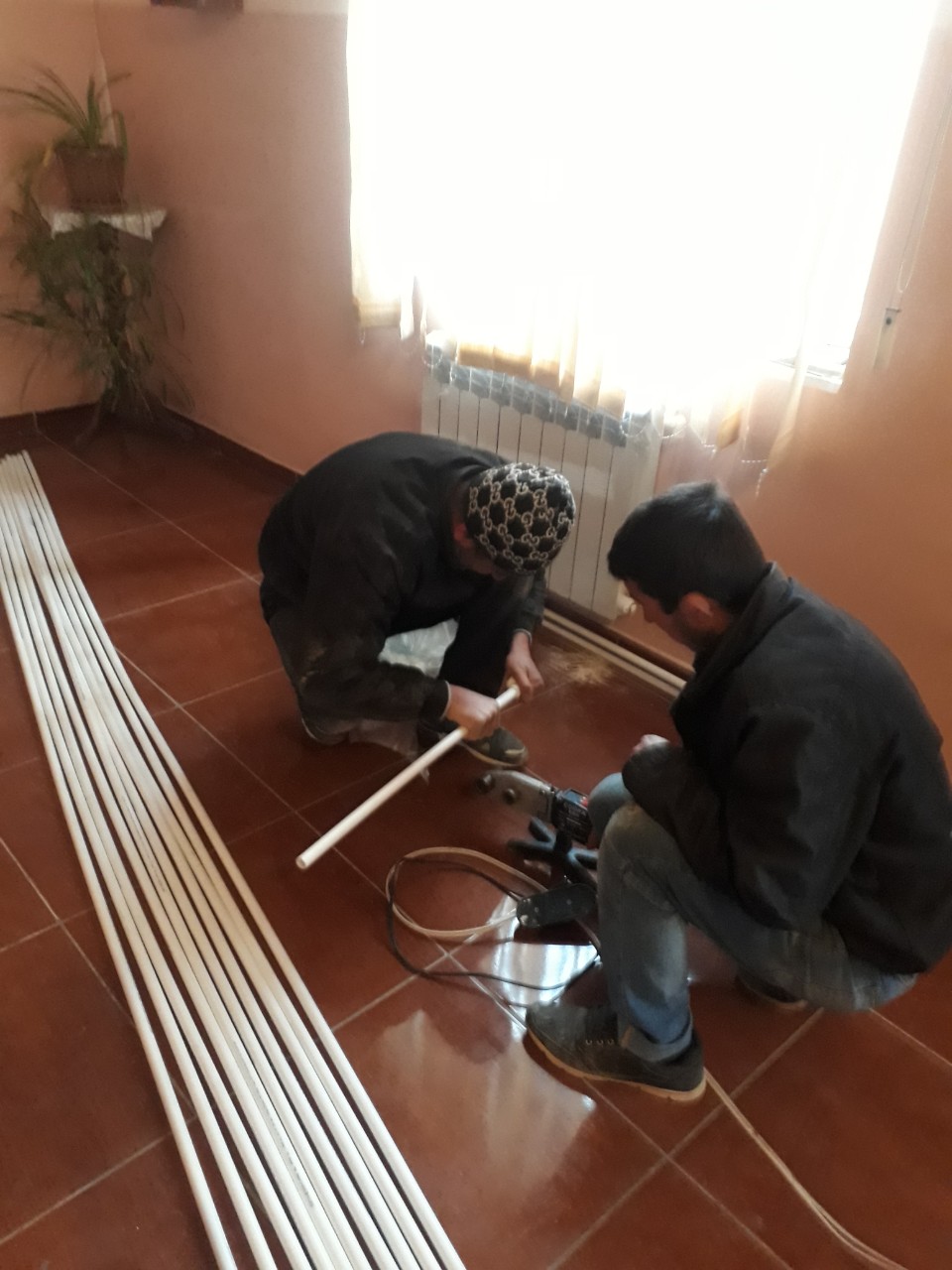With the work on the walls and ceiling completed, the crew starts the work on installing the new tile flooring.
