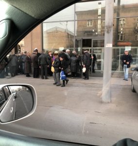 People lined up for free bread for Yerevan’s City Market’s baking facility in Malatya.