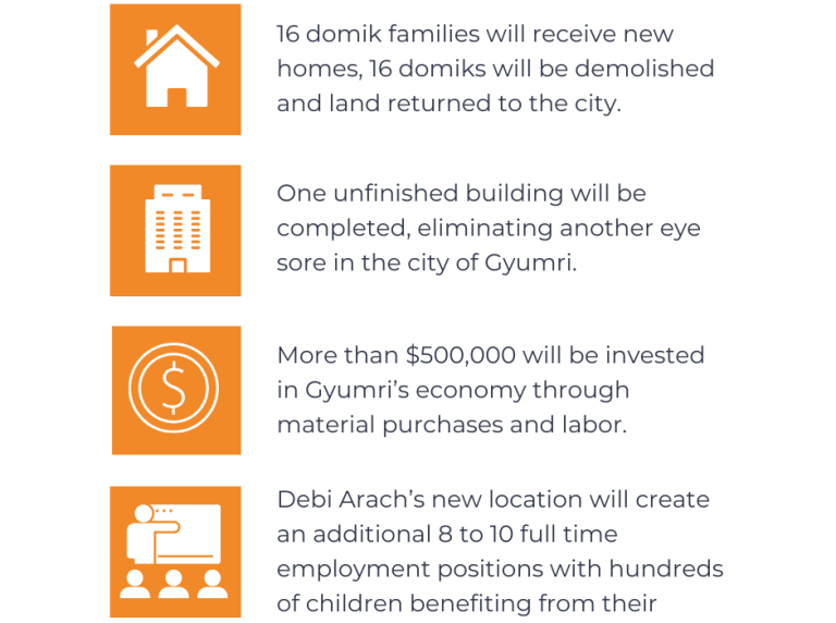 To help solve the desperate housing situation in Gyumri, the Municipality has given The Paros Foundation an 18,000 square foot building to create 16 residential apartments for domik families living in terrible conditions. Once construction is completed, this space will also be home to a second Debi Arach Children’s Center, a flexible vocational training space and a social enterprise.