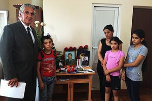 Roger Strauch, Paros Foundation Chairman, and team members Peter Abajian and Kegham Minassyan meet with the mother and brother of fallen Hero, Ashot Shahbazyan.