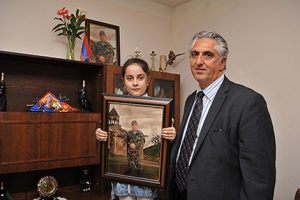 Volunteer Suren Djaratanyan’s granddaughter poses with a photo of her Hero grandfather.
